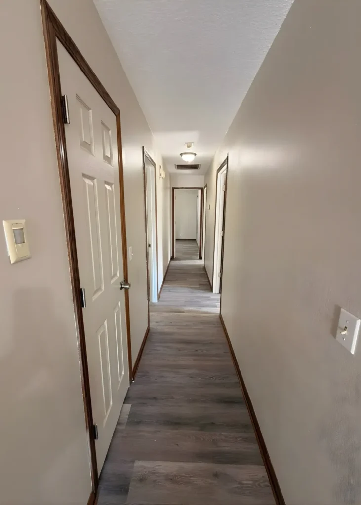 The hallway was updated to match the rest of the home’s renovation. We removed all existing carpet, installed new flooring, and repainted the walls for a cleaner, brighter look. The space now ties seamlessly into the freshly remodeled living areas and adds to the overall flow of the home.