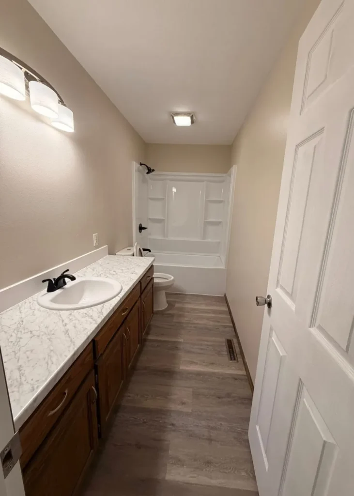 This bathroom was fully rebuilt from the ground up. We removed the old shower and tub and installed a completely new setup for a cleaner, modern look. New countertops, updated flooring, and a fresh sink brought the space up to date, while new light fixtures improved both style and visibility.We finished the project with a full repaint, giving the bathroom a fresh, bright look that ties all the upgrades together.