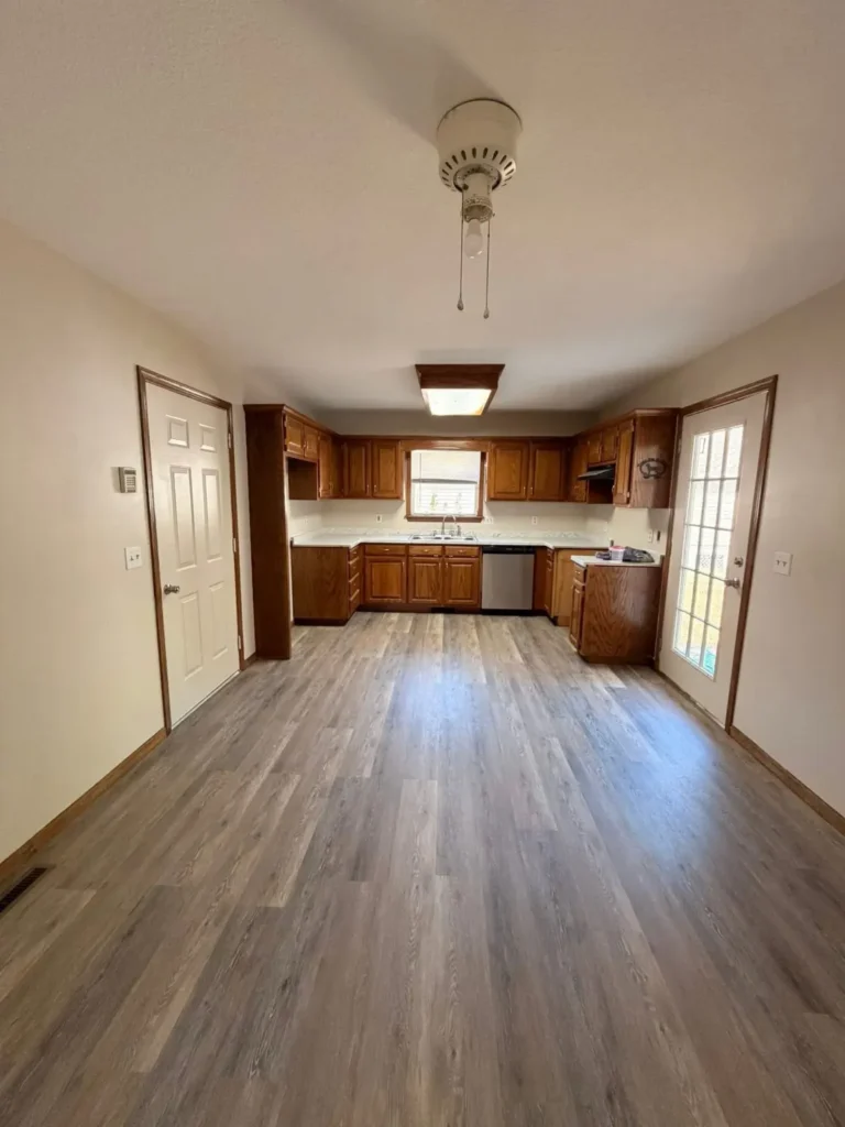 The kitchen received a full upgrade to match the rest of the home. We replaced all flooring, repainted every surface for a fresh, modern look, installed new countertops, and updated the trim throughout the space. These changes completely refreshed the kitchen and brought it in line with the home’s overall renovation.