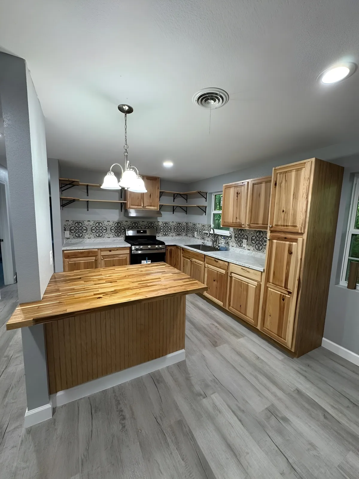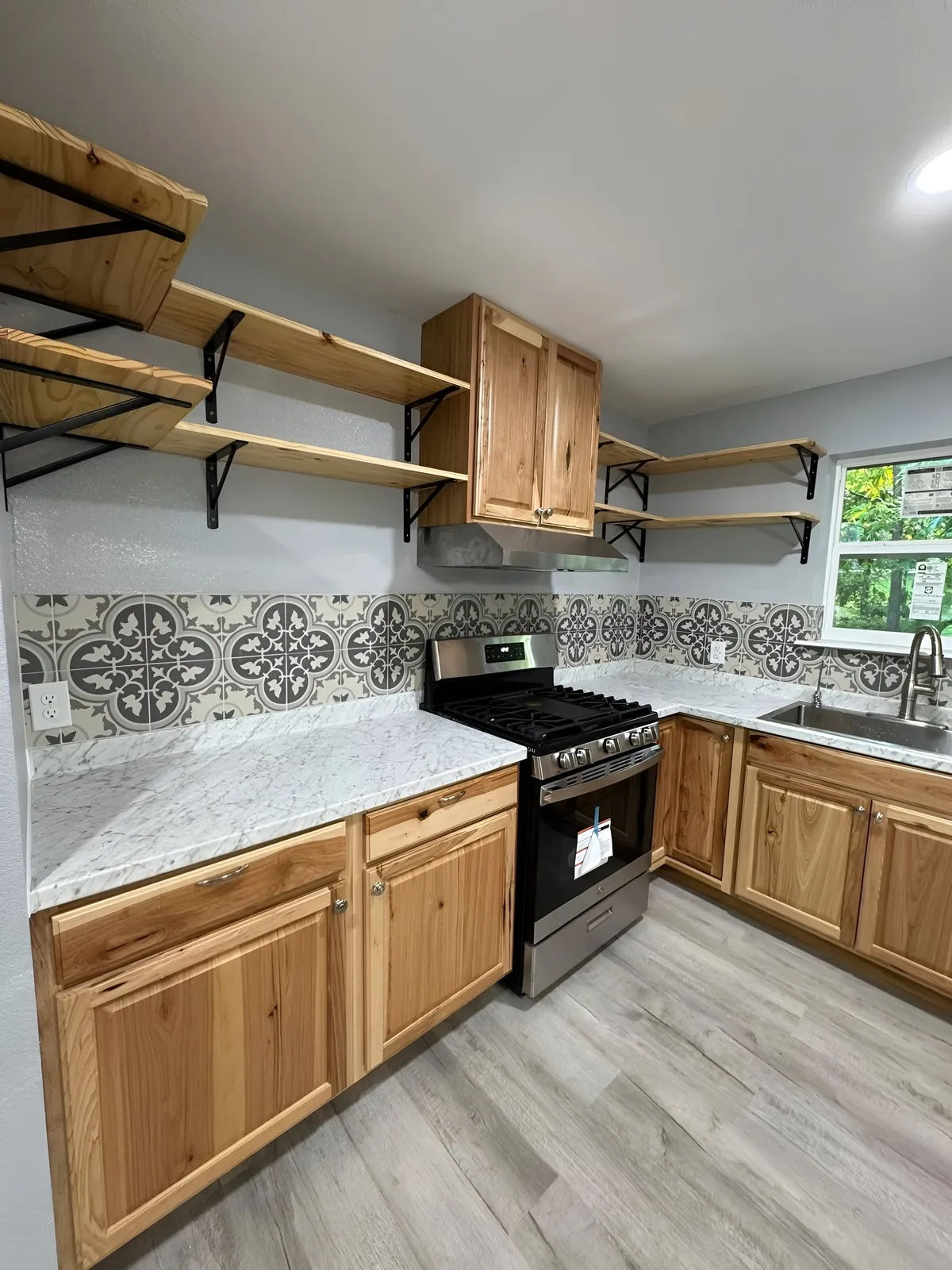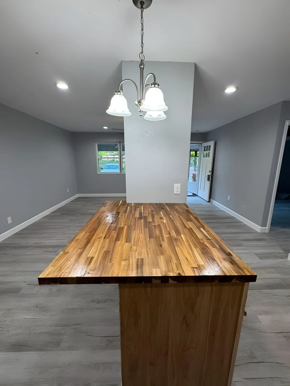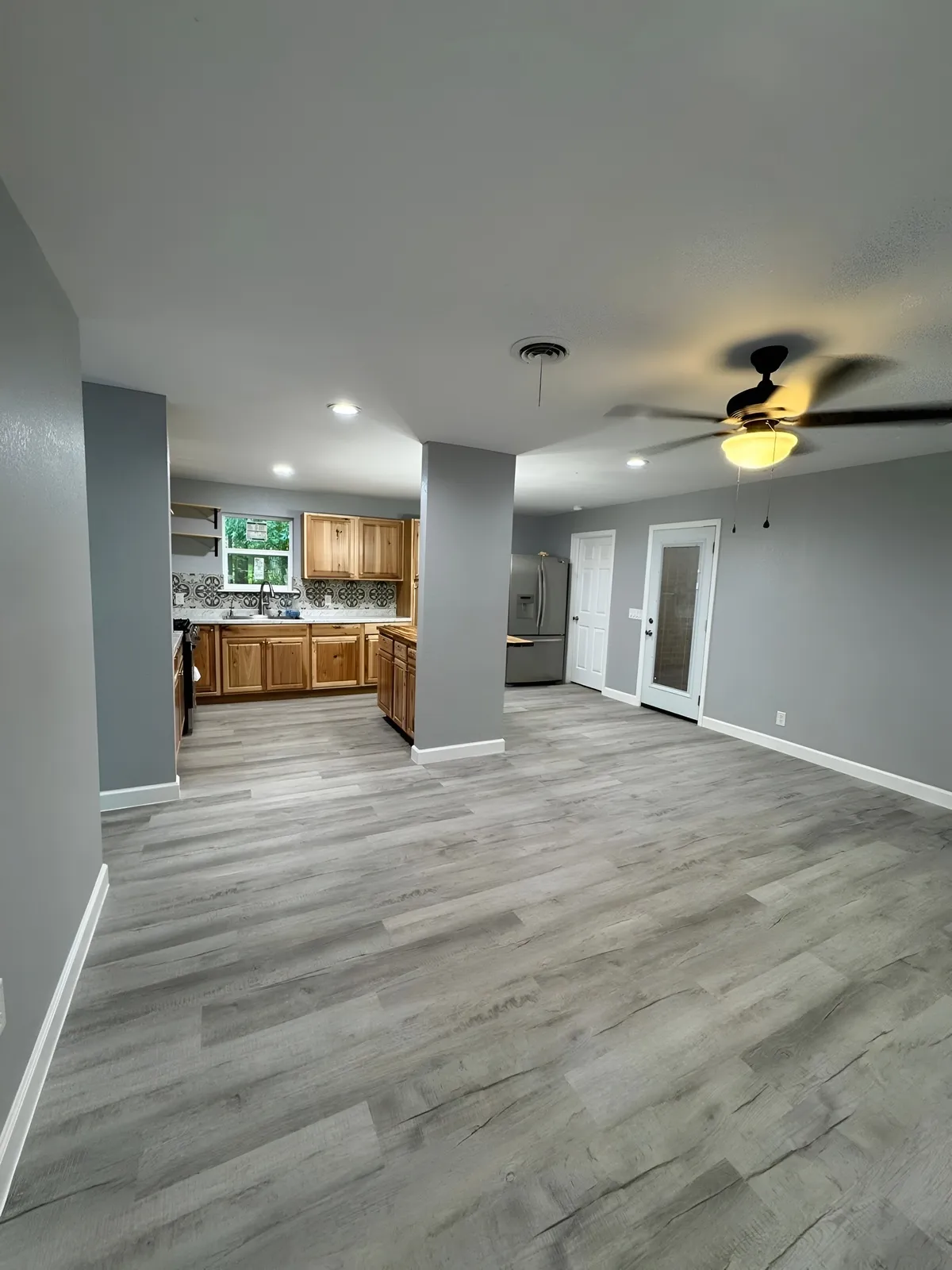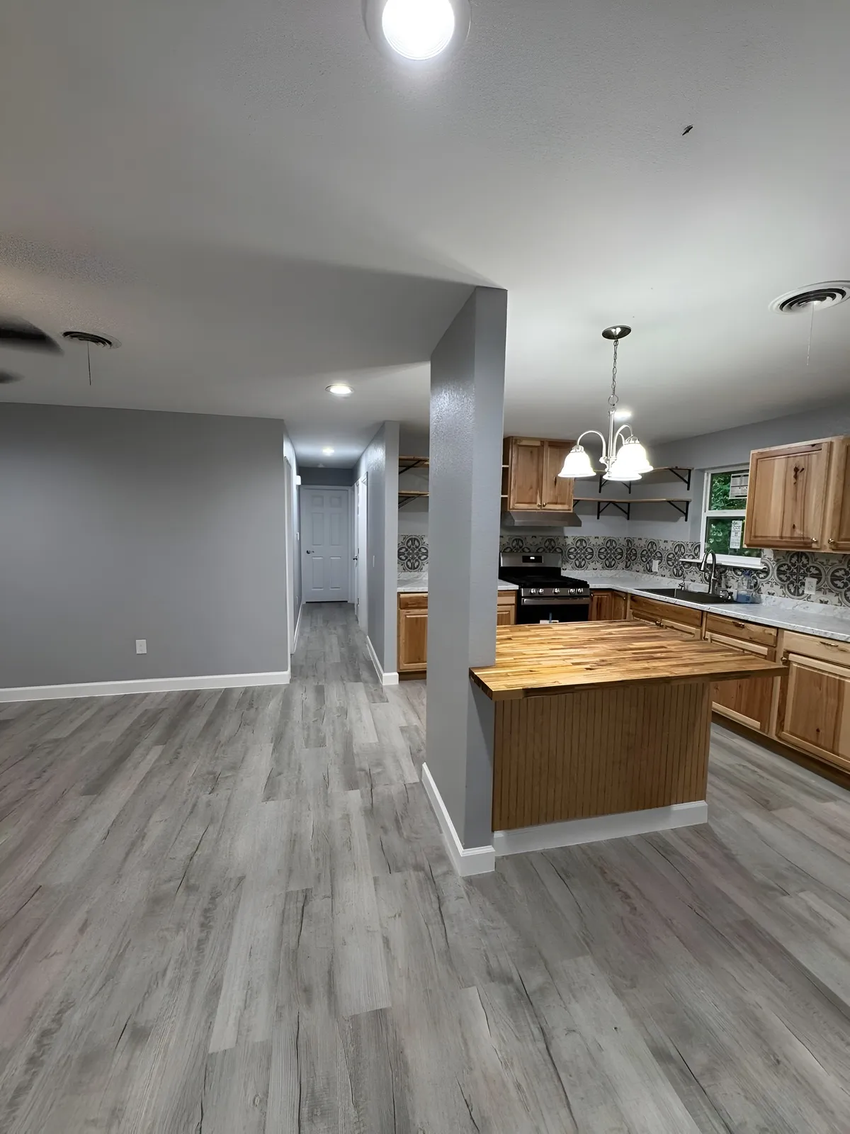 We removed the damaged flooring, cleared out old materials, and repaired the underlying structure. New drywall work, modern flooring, updated lighting, and a full repaint immediately started transforming the space. The kitchen received upgraded surfaces and cleaner design lines, while the living area was refreshed with brighter finishes and better flow. Every detail was improved to create a cleaner, more modern look that homeowners appreciate and buyers notice.